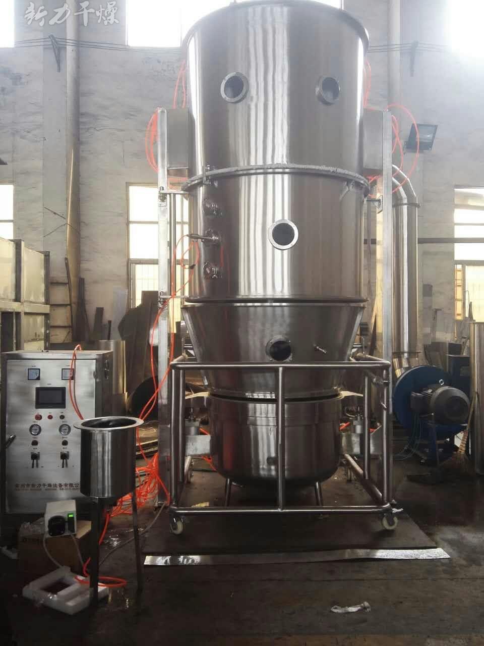 物料粉末粒子,在原料容器(流化床)中呈環(huán)形流化狀態(tài),受到經(jīng)過凈化后的加熱空氣預(yù)熱和混合,將粘合劑溶液霧化噴入,使若干粒子聚集成含有粘合劑的團粒,由于熱空氣對物料的不斷干燥,使團粒中水分蒸發(fā),粘合劑凝固,此過程不斷重復(fù)進行,形成理想的、均勻的多微孔球狀顆粒。